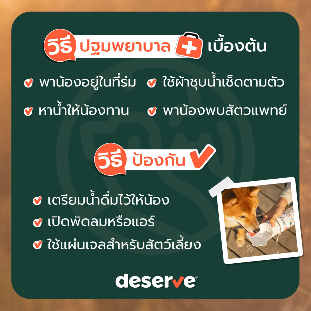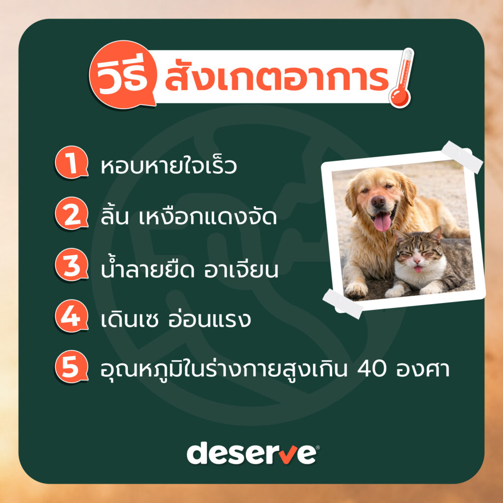 หากพ่อๆแม่ๆ สังเกตเห็นน้องหมาน้องแมวมีอาการหอบรุนแรง น้ำลายไหลยืด เหงือกมีสีแดงจัด หรือเดินเซ ให้รีบนำน้องเข้าที่ร่มทันที ใช้ผ้าชุบน้ำอุณหภูมิห้องเช็ดตามข้อพับและอุ้งเท้า (หลีกเลี่ยงน้ำแข็งจัดเพราะอาจทำให้ช็อก) และส่งพบสัตวแพทย์โดยเร็วที่สุด
