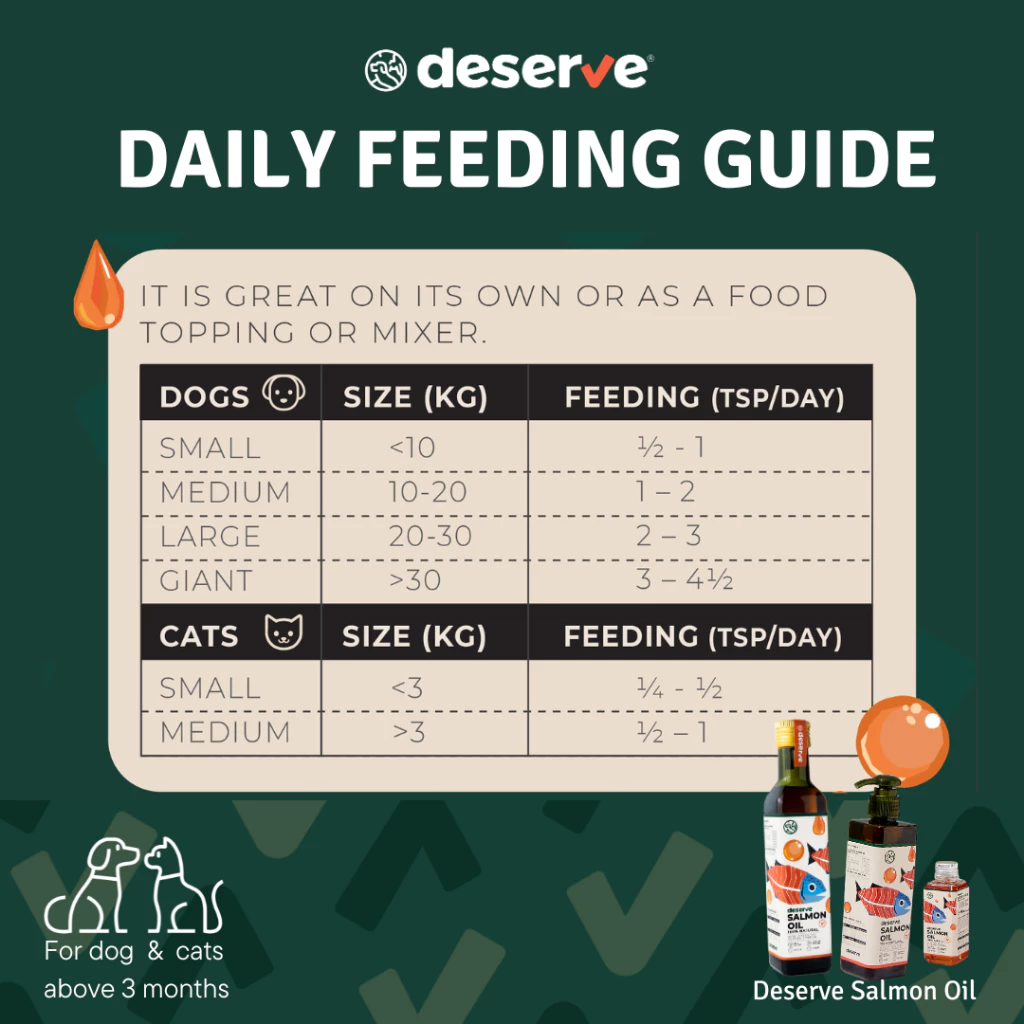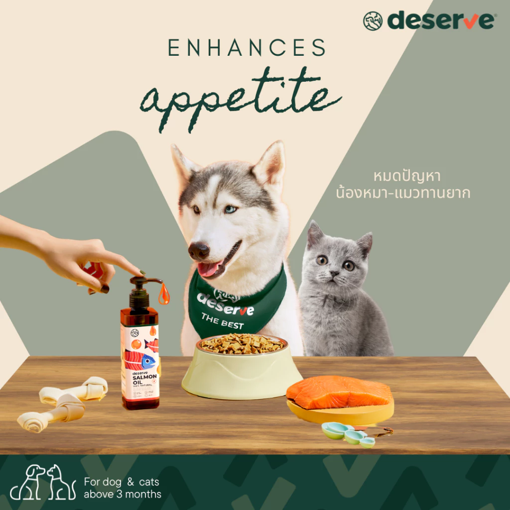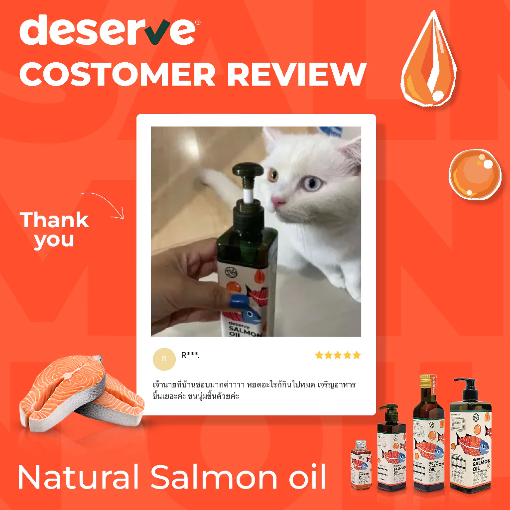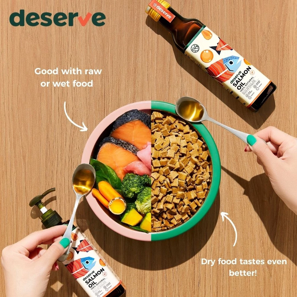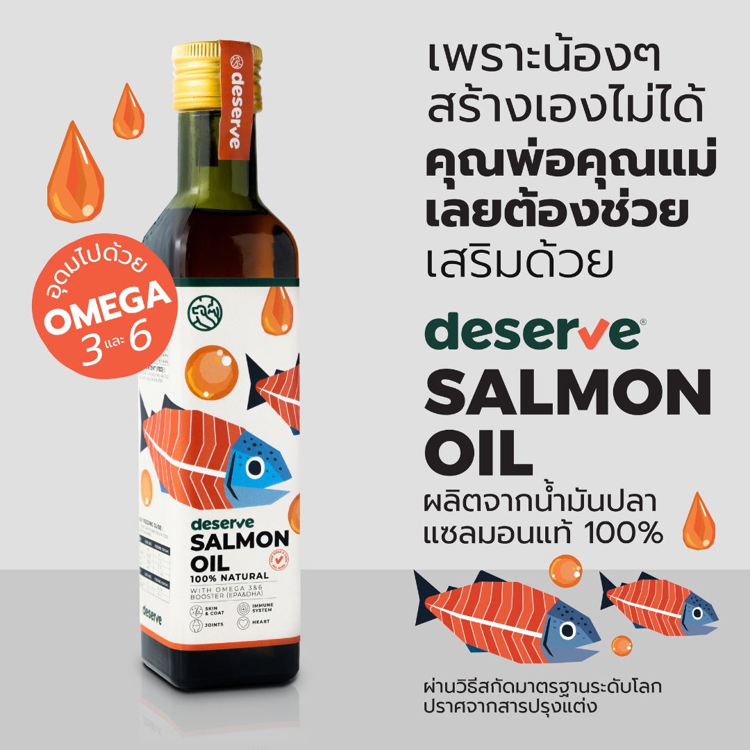 DESERVE นํ้ามันปลาแซลมอนแท้ 100% ไอเทมเด็ดเพิ่มความอร่อย ให้น้องหมาน้องแมวที่ทานยาก แถมยังได้คุณประโยชน์จาก Omega 3 & 6 (EPA & DHA) ซึ่งเป็นกรดไขมันจำเป็นที่ลูกรักสร้างเองไม่ได้ ช่วยบำรุงครบตั้งแต่ภายในสู่ภายนอก
